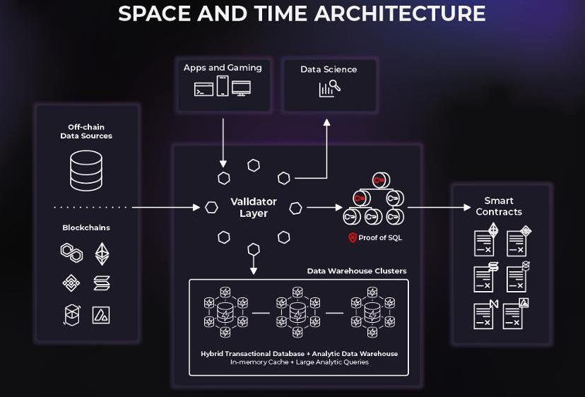 SpaceandTime是两层网络,由验证器层和数据仓库组成。SxT平台的成功取决于验证器和数据仓库的无缝交互,以促进对链上和链下数据的简单和安全查询。数据仓库由数据库网络和计算集群组成,这些网络由spaceandtime验证器控制并路由到它们。Spaceandtime采用了一种非常灵活的仓储解决方案:HTAP。Validator监视、命令和验证这些集群提供的服务,然后编排最终用户和数据仓库集群之间的数据流和查询。Validator为数据进入系统和数据退出系统提供了一种手段。路由——支持与去中心化数据仓库网络的事务和查询交互流媒体——充当大容量客户流媒体工作负载的接收器共识——对进出平台的数据提供高性能的拜占庭容错查询证明——向平台提供SQL证明TableAnchor——通过在链上锚定表向平台提供存储证明Oracle——支持Web3交互,包括智能合约事件监听和跨链消息传递/中继安全性——防止未经身份验证和未经授权访问平台