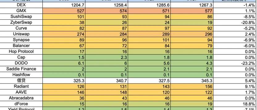本周TVL出现1.6B的下跌,下降幅度为2%。本周ETH链占比同样下降,从上周的59.33%下降到58.8%,降幅~0.5%,但近几个月的大趋势看eth生态的TVL在稳定上升。从近七日的数据看,在以太坊二层网络的核心公链中,Optimism本周下跌为1.9%,Arbitrum上涨1.65%,Polygon下跌1%,Avalanche下跌2.87%。三、各链协议锁仓量情况