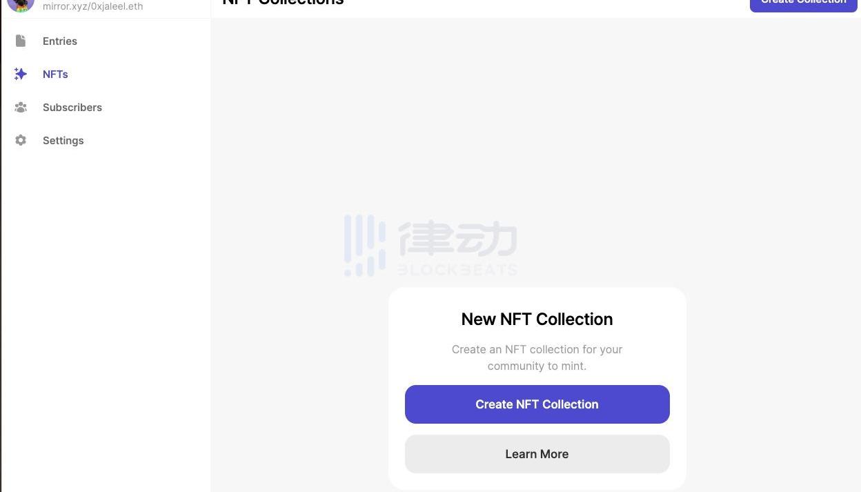 在铸造完成MirrorGenesisNFT之后,得到SubscribetoMint功能的测试。创作者可以进入Mirror官网,点击NFTs,接着点击CreateNFTcollection。