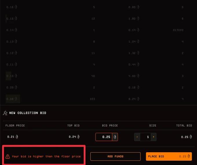 5.监控低价Bid你可以用远低于地板价的Bid来赚取小部分BLUR奖励。\n\n但是,你可能也会忘记取消它而最终得到一大袋你不想要的NFT。因此,在Bid之前,你可以从@oSnipeNFT(Discord)或@etherdrops_bot(Telegram)来获取NFT的价格提醒。6.Bid的价格不要高于地板Blur上的某些NFT收藏品可以Bid但不能交易。\n\n自然地,degens发现他们可以通过该方法无风险地Bid并赚取积分。但是,当收藏品交易被启用时,高价的Bid就会被接受,例如,某交易者出价2ETH购买一个底价为0.4ETH的收藏品,该收藏品在Blur上不可交易,但可以接受他们的Bid。\n\n但当该系列激活了Blur交易时,该交易者的Bid就会立刻成交。