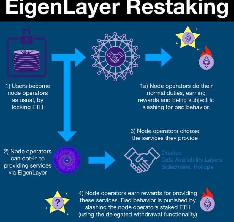 Eigenlayer提出的再质押方案,允许用户将ETH、lsdETH及LPToken质押在其他公链、预言机、中间件等,作为节点并得到验证奖励,这样第三方项目可以借用ETH主网的安全性,ETH共识层的安全性得到释放。