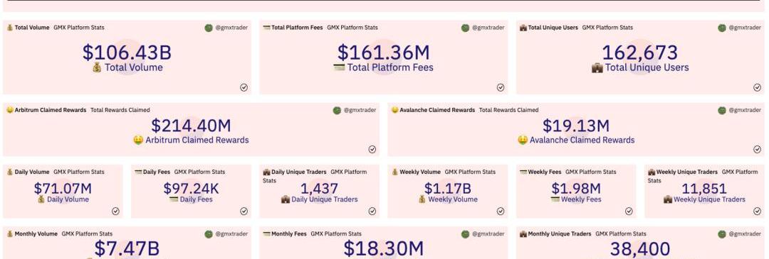 自22年GMX代币上线币安后,GMX的各项数据接连创下新高。截至目前,GMX的平台总交易量已超过1000亿美金,AUM超10亿美金,独立地址超过16万,分发给用户的费用超过1亿美金。