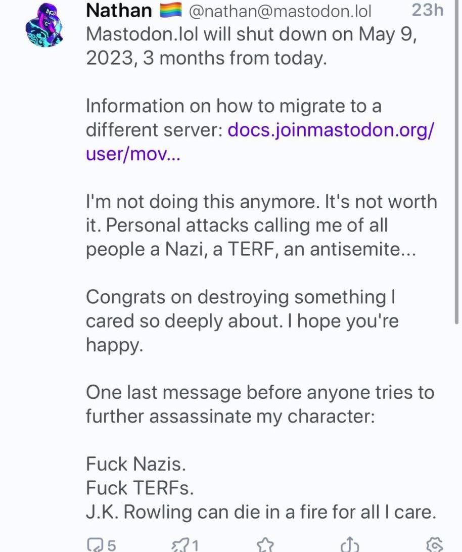 Nostr实现了社交网络从未支持过的功能:设身处地为他人着想的能力。想看看别人的信息究竟是什么样子?只需用他们的公钥设置一个只读帐户。如果这一功能足够有趣,则nostr客户端可以添加一个「以...方式查看信息」功能,该功能可以像用户个人资料屏幕上的按钮一样简单。不受联邦的约束。所有其他「言论自由」平台仍然具有中心化的一面。如果你发现正在使用的应用程序具有与之关联的「服务条款」,那么你对这个社交媒体没有主权。Mastodon用户已经发现了这个问题的严重性。回到我之前的观点,运行服务器对用户的要求很高……很少有人能够处理「公共空间」的管理员滥用权力。