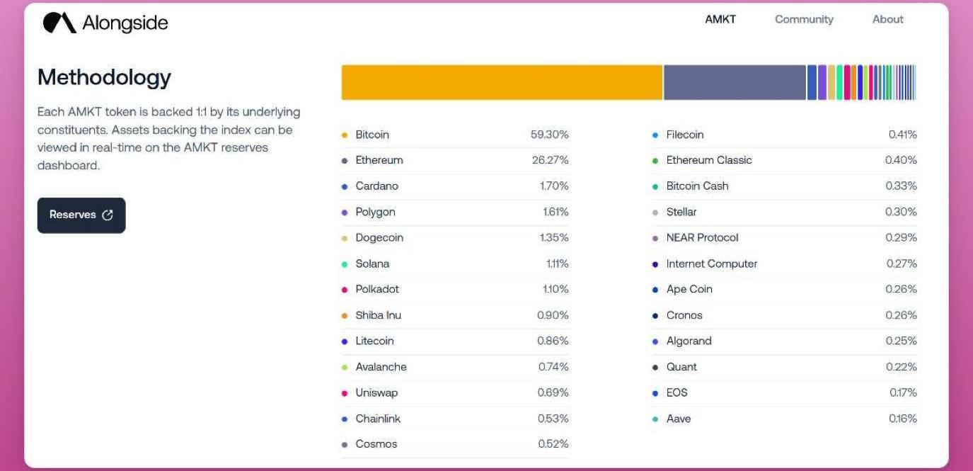 在TradFi市场中,指数是大众资本配置,他们遵循一套称为「方法论」的准则,通常是按市值加权,根据其市值添加或删除资产。AMKT现仅支持25种加密资产,因为其他资产没有流动性深度。目前,加密市场上主要的加密指数builder都有:-IndexCoop-AlongsideFinance-PhutureFinance-IndexedFinance-PieDAO数据显示,加密指数领域的市值很低,约为9040万美元。