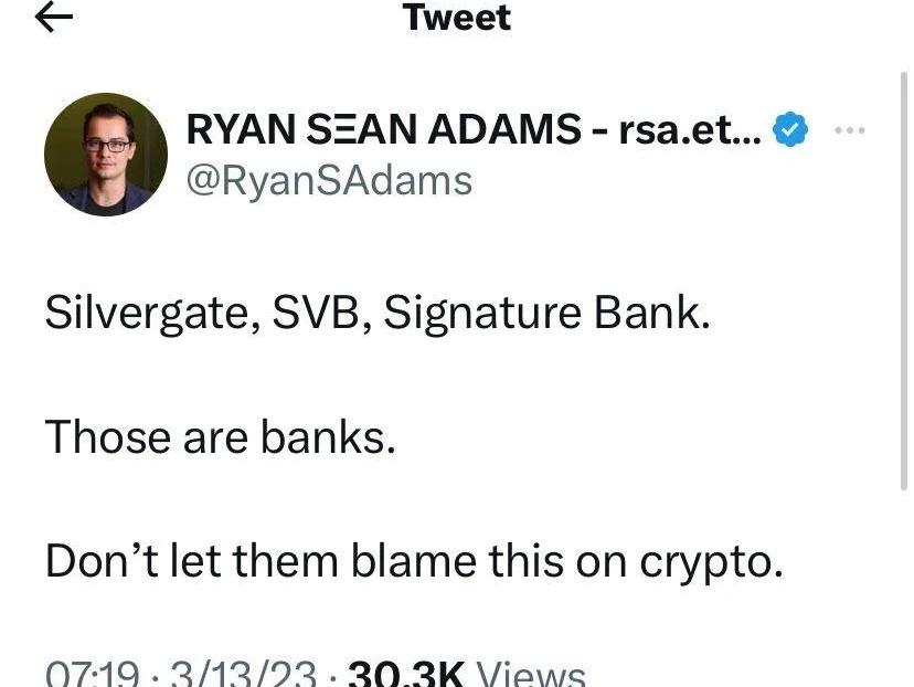 来源https://twitter.com/RyanSAdams/status/1634892046447308800“Silvergate、SVB、Signature,这些都是银行。不要让那些人甩锅crypto。”