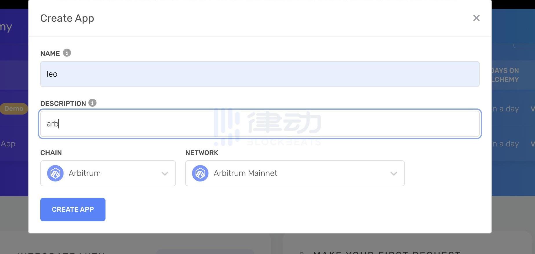 填写相关信息,选择ArbitrumMainnet,点击创建应用「CREATEAPP」;