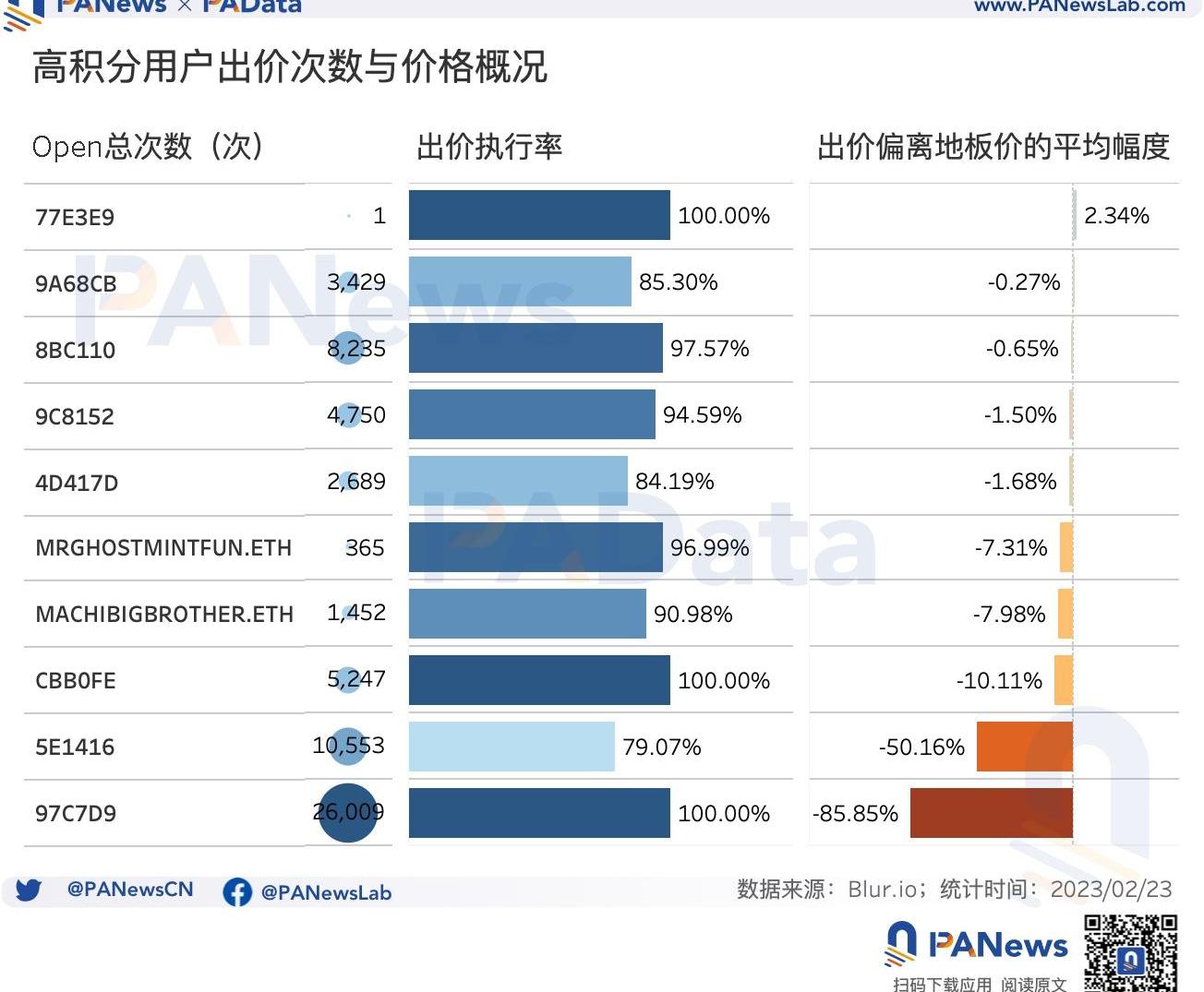 2月15日凌晨,NFT交易平台Blur进行了第一轮空投,向超12万地址共空投3.6亿枚代币,有超12万地址。按上线当天价格算,有5835个地址获得了1万枚以上,约获利超6500美元,还有23个地址获得了100万枚,约获利65万美元。目前,第二轮空投已经开启,尽管激励细则还未公布,但在4月1日之前,所有出价和上架行为都将获得双倍积分。在第一轮“造富神话”刺激下,不少人都将视线转向了“刷积分”,这为NFT市场带来了久违的活力,交易量不断攀升。Blur的连续空投计划,以及其背后牵连的Bidding与Points机制将会为NFT市场带来怎样的变化?PANews数据专栏PAData将结合近期NFT交易市场数据和Blur的交易数据集中讨论以下问题:在宏观层面,Blur空投对整个NFT交易市场而言,是刺激了“消费者剩余”,还是抢占了其他交易市场的“蛋糕”?在微观交易层面,越接近地板价的Bidding能获得的Points越高,这是否会推动NFT价格下行?不同项目的出价深度有何区别?高积分用户是如何通过Bidding和Listing行为积累积分的:他们主要Bidding什么项目?出价策略是什么?目前的预估营收情况如何?数据分析显示:Blur刺激了新的交易需求。15个交易市场最近一周的日交易量涨幅达到229.05%,日交易地址数涨幅约为19.46%。Blur的日交易量为涨幅达到467%,日交易地址数涨幅为46%。在最近的市场增量过程中,Blur对其他多部分交易市场都形成了挤压,在交易量方面尤为明显,在用户规模方面压力较小。这也在一定程度上说明,Blur在此次增长中吸引了更多“高净值”用户。10个头部项目的竞价深度在地板价和高于地板价1%的范围内最佳,6个热门项目的竞价深度在低于地板价5%的范围内最佳。Points规则发挥了预期的作用,使出价价格向地板价靠。根据统计,Blur上最近7天交易量最高的100个项目,最高出价偏离地板价的平均幅度约为0.72%。这最终使得地板价便有了下行动力。交易量前100的项目,在Blur上的地板价较在Opensea上的平均低4.97%,在Blur上的7天交易量较Opensea上的平均高0.59%。但跨市场层面不存在量价关系,即Blur上更高的交易量与地板价高低无关,地板价更低主要受到Bidding-Points机制影响。对于头部项目而言,Blur上的地板价全部低于Opensea,尤其是BoredApeYachtClub和Doodles,分别低了9.98%和6.51%,这也解释了为什么这两个项目的竞价深度集中在地板价以上5%的范围内。被3个及以上高分用户出价的项目有17个,其中,PudgyPenguins、Moonbirds、CloneX和BoredApeKennelClub被8个高积分用户出价过。10个高积分用户有效出价总次数约6.27万次,平均出价偏离地板价的幅度约为-16.32%,平均出价执行率约为92.87%。其Bidding模式可以大致分为三类。10个高分用户目前持有的NFT,按照地板价估算后的总价值都低于成本,即当前都处于预估亏损状态。平均预估亏损90ETH,相当于14.49万美元。想要获得高积分,是需要投入较大资金成本的,并且,在积分规则的鼓励下,Blur市场上的地板价有下行动力,这使得参与Bidding的用户需要持续地、动态地管理自己的成本-预估价值差,这个差距的管理标准应该是对空投价值的预期。Blur刺激新交易需求,15个交易市场中12个的交易量都有增长