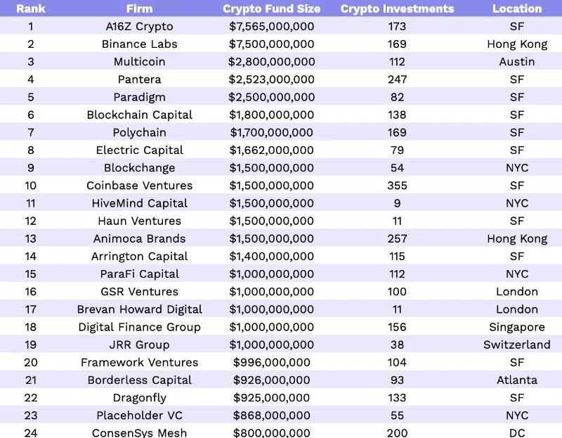 哪些以加密货币为重点的风险投资公司最大?哪些最积极地在后Terra/ThreeArrows/Celsius/FTX事件中进行投资呢?按基金规模来看,最大的以加密货币为重点的VC公司是:A16ZCrypto、BinanceLabs、Multicoin、Pantera和Paradigm。按全部加密货币投资数量来看,前五大以加密货币为重点的VC公司是:CoinbaseVentures、DCG、NGC、AU21和Animoca。但在过去12个月里,哪些公司在新的加密货币VC投资领域处于领先地位呢?目前最活跃的加密货币VC公司是:BigBrainHoldings、ShimaCapital、InfinityVentures、GSR和MHVentures。让我们深入分析并进行全面排名。按基金规模划分的全球最大的加密货币风险投资公司