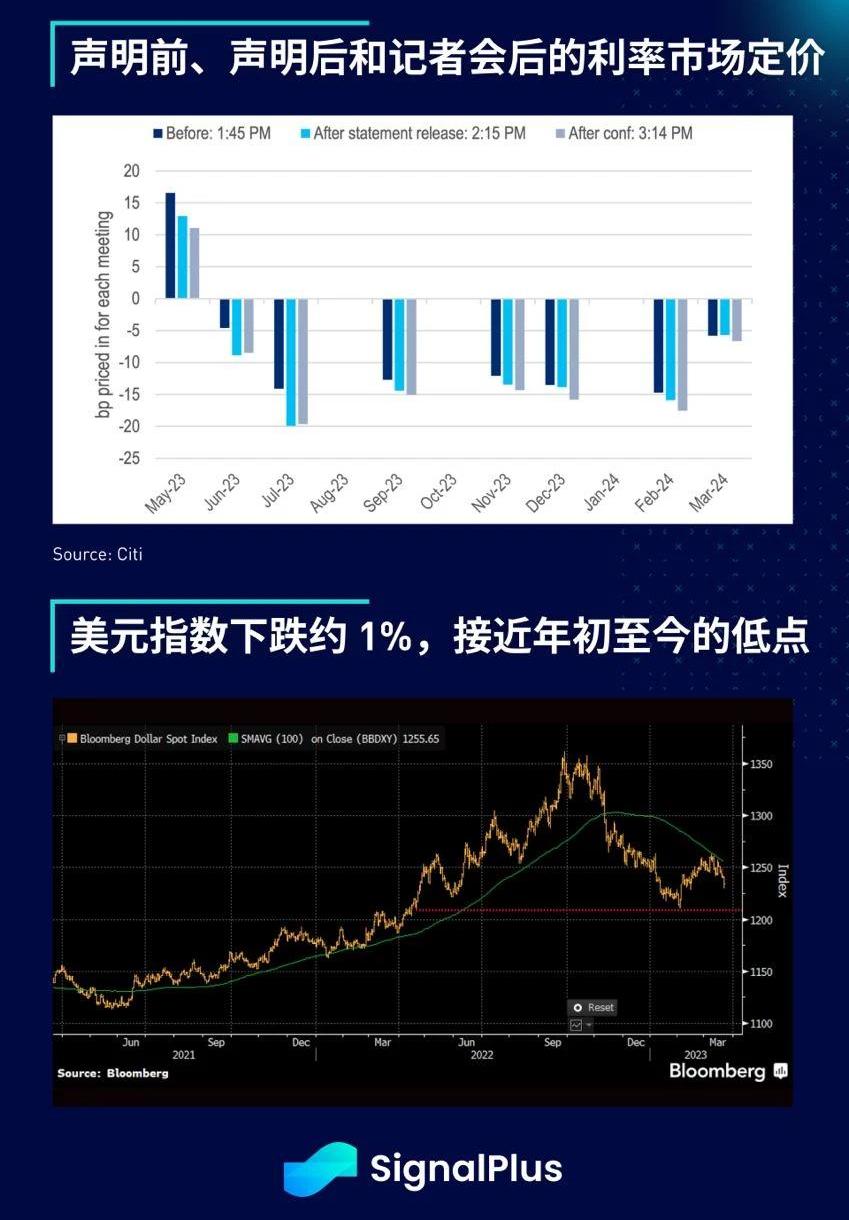 -FOMC会议后市场反应为利率下降、美元走软和股市走低。2年期收益率下滑18个基点,10年期收益率下跌11个基点,5月加息的可能性降至40%左右,市场并定价7月降息。5年期实质利率当天下跌25个基点,接近年初以来的低点,DXY指数也下跌1%,两者走势相似。此外,Powell青睐的衰退指标曲线(3mvs18m3m)跌至2001-2002年以来的低点,暗示未来可能会出现经济困境。
