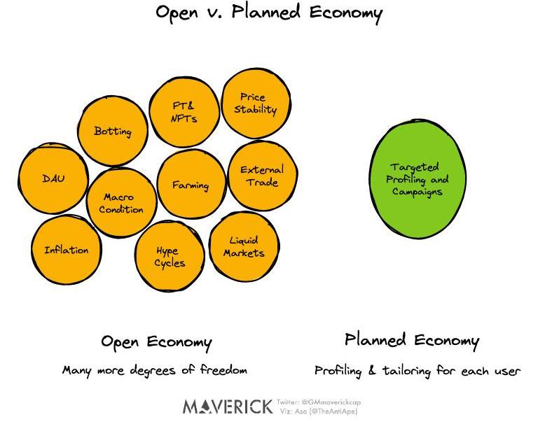 我们毫不怀疑,最终目标非常令人兴奋。利用加密货币的承诺将游戏内部经济活力提高10倍,以重新创造像《原神》或《梦幻西游》这样的游戏,这是任何人的梦想。但在加密MMO经济从头开始腾飞之前,我们确实确定了很多困难的先决条件:必要的复杂性:为了拥有足够的可持续性经济,游戏本身可能需要足够的多样性和复杂性。为了正确表示这样的游戏逻辑,我们需要跨不同级别和专业领域拥有许多不同的可替代和不可替代的资产。聚合交易流动性:鉴于资产的复杂性和数量,市场需要有足够的交易活动才能有可操作的流动性。这种聚合交易活动可以解释为DAUx平均每日交易次数。但是,是否有足够大的玩家基础来支持以交易为中心的沉浸式MMO游戏?自由和滥用:自由意味着存在滥用和剥削性行为的潜力。即使在像《DarkForrest》这样简单的游戏中,公会也可能表现出有害其他玩家体验的滥用行为。更复杂的游戏只会面临更大的风险。如何调节这些滥用行为,或者它们是否应该由中央调节,这些仍然是一个开放性问题。经济管理和中心化:在真正的经济中,有中央银行和财政部门,会以一种相当自由的方式调节经济活动。在传统游戏中,庞大的运营团队夜以继日地工作以平衡数字。建立一个完美的经济是不可能的,并且它也不可能永远完美运转。但是,中央经济调节自然会与加密的所有权承诺和可信中立性产生紧张关系。在可玩性和所有权可预测性之间找到微妙的平衡将是具有挑战性的。