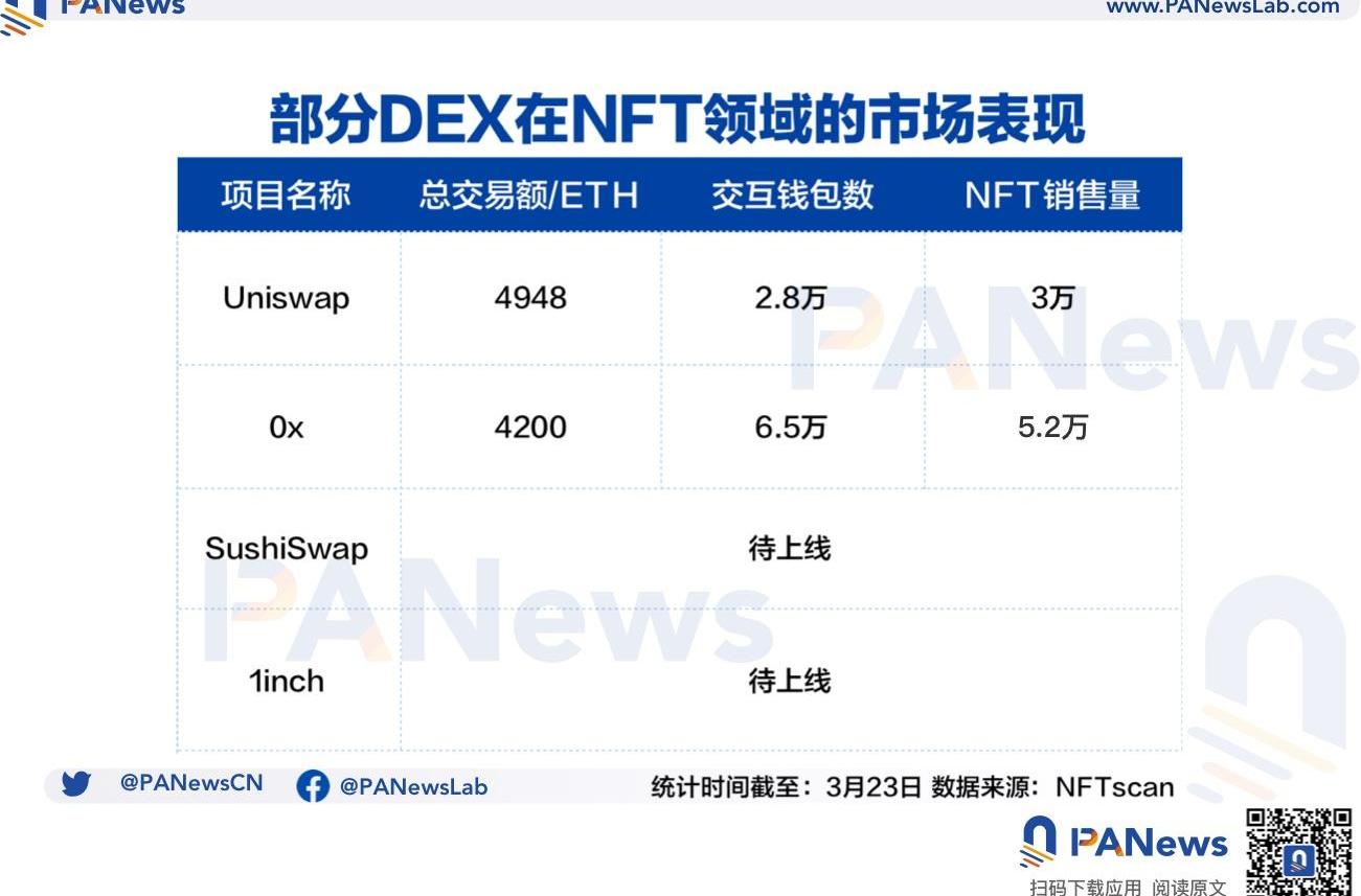 0x是一种开放、以太坊上支持点对点资产交换的协议,它能够在以太坊网络中实现DeFi应用。NFTScan数据显示,截至3月23日,0x的总交易额已超4200ETH,NFT出售数量约5.2万个,交互钱包数超6.5万。整体来看,0x的日交易量基本均为个位数。此外,SushiSwap此前也宣布推出去中心化品牌授权和孵化器框架SushiStudios也计划在第一季度推出NFT市场。整体来看,现阶段这些DEX尚且不能成为NFT的流动性释放利器,而1inch入局后是否会有所改变,一切还需等其正式上线后才能知晓。