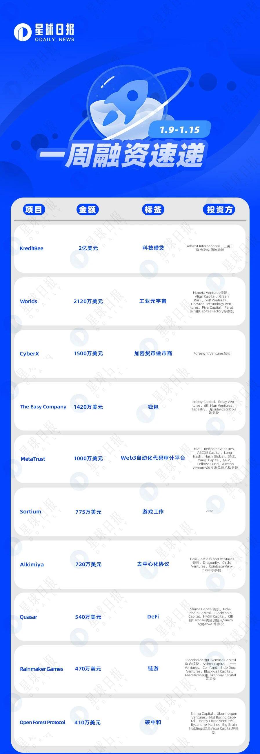 *印度借贷平台KreditBee完成2亿美元D轮融资,日本三菱日联金融集团等参投1月9日,印度金融科技借贷平台KreditBee完成2亿美元D轮融资,其中,私募股权巨头AdventInternational为其提供1亿美元投资,另外1亿美元由日本三菱日联金融集团以及现有投资者PremjiInvest、MotilalOswalAlternates、NewQuestCapitalPartners和MiraeAssetVentureInvestments参投完成,新资金将用于扩大现有业务的规模,并通过涉足数字化金融产品来实现产品多元化。KreditBee首席执行官MadhusudanEkambaram表示,“最新一轮融资将帮助我们实现为该国4亿多中等收入人口提供服务的愿景”。工业元宇宙公司Worlds完成2120万美元A轮融资,MonetaVentures领投1月9日,工业元宇宙公司Worlds完成2120万美元A轮融资,MonetaVentures领投,AlignCapital、GreenPark、GolfVentures、ChevronTechnologyVentures、PivaCapital、PerotJain和CapitalFactory等参投。该公司从HypergiantSensorySciences更名为Worlds,是一家为工业企业构建车间运营数字孪生模型以提高其生产力或效率的公司,新名称将反映其为推销所谓用于构建工业元宇宙的4D基础设施所做的努力。该公司表示,其其他客户包括雪佛龙、马来西亚国家石油公司和HillwoodDevelopmentCompany。加密货币做市商CyberX完成1500万美元A轮融资,ForesightVentures领投1月12日,加密货币做市商CyberX完成1500万美元A轮融资,ForesightVentures领投,新资金将用于改进其专有的风险管理框架,该框架实时监控链上和链下数据。创始人ZackFan表示,该公司的估值升至“几亿美元的范围”,这笔交易没有其他投资者参与,“尽管其他投资者也有兴趣,但该公司最终还是选择了单一投资者”。“社交”加密钱包TheEasyCompany完成1420万美元种子轮融资,LobbyCapital等参投1月11日,“社交”加密钱包TheEasyCompany完成1420万美元种子轮融资,LobbyCapital、RelayVentures、6thManVentures、Tapestry、Upside和Scribble等参投。这笔资金将用于继续构建社交产品,同时也将用于扩大区块链支持。Easy旨在将用户精选的个人资料与引人入胜的社交功能相结合,以便人们可以自行搜索、导航和发现web3的世界。Easy的设计具有跨链功能,目前与以太坊和PolygonNFT兼容,并计划在未来支持更多区块链。Web3自动化代码审计平台MetaTrust完成约1000万美元种子轮融资,Longhash等参投1月9日,Web3自动化代码审计平台MetaTrust联合创始人LiuYang在采访中表示,MetaTrust已经完成约1000万美元种子轮融资,M23、RedpointVentures、ABCDECapital、Longhash、HashGlobal、SNZ、YunqiCapital、GGV、FellowsFund、AimtopVentures等多家风投机构参投。MetaTrust计划于2023年第一季度计划推出四款产品,并将在实现收入和利润目标后寻找下一轮融资。Web3娱乐技术开发商Sortium完成775万美元种子轮融资,加密对冲基金Arca参投1月13日,Web3娱乐技术开发商Sortium完成775万美元种子轮融资,加密货币对冲基金Arca参投。Sortium首席执行官MarcSeal在接受采访时证实,该公司在向美国SEC提交的文件中披露了本轮融资,包括Arca参投的细节。Seal没有具体说明其余投资方名称,但表示还包括其他加密原生公司。Sortium的大约50名员工包括区块链工程师、人工智能工程师和一个完整的游戏工作室,该工作室可以推出自己的游戏或帮助合作伙伴开发游戏。Sortium专注于展示其技术框架,以帮助潜在合作伙伴和客户了解生成式人工智能系统、区块链和动态私营经济系统可以实现的目标,这家初创公司还准备推出其首款玩赚游戏。此外,Sortium仍在考虑从对种子轮感兴趣的投资者那里再接受最多200万美元的资金,该公司还在制定如何以及何时进行A轮融资的战略。去中心化协议Alkimiya完成720万美元融资,1kx等领投1月12日,去中心化协议Alkimiya在去年11月完成720万美元融资,1kx和CastleIslandVentures领投,Dragonfly、CircleVentures、CoinbaseVentures等参投,旨在“为区块空间建立去中心化资本市场”。这笔资金将主要用于扩大其团队,Alkimiya准备在今年第一季度推出完整的产品套件,包括Vault产品和以太坊主网上的ETH质押合约。据此前报道,去年3月,面向共识资本市场的无许可开源协议Alkimiya宣布上线Avalanche主网。据介绍,Alkimiya由两部分组成:Silica是区块空间生产者发行的float-to-fixedswap;HashVault是打包Silica合约并将基础现金流重组至各种金融产品的vault。Cosmos生态DeFi协议Quasar以7000万美元估值融资540万美元,ShimaCapital领投1月12日,基于Cosmos的DeFi协议Quasar以7000万美元估值融资540万美元,ShimaCapital领投,PolychainCapital、BlockchainCapital、HASHCapital、CIB和Osmosis联合创始人SunnyAggarwal等参投。新融资将用于产品开发和扩大团队规模。据介绍,该协议允许用户创建和加入vault,即能够连接代币和链间数据传输的独立资产容器。Quasar计划为DeFi提供结构化投资产品,首先是Cosmos生态系统的自动再平衡指数,该指数支持资产的剥离。经过几个月的私下测试,Quasar将于2月10日开放其公共测试网。链游平台RainmakerGames完成470万美元融资,Placeholder等领投1月9日,区块链游戏平台RainmakerGames宣布完成470万美元种子轮融资,Placeholder和HivemindCapital联合领投,ShimaCapital、PeerVentures、Coinfund、SideDoorVentures、BlockwallCapital、Placeholder和TokenbayCapital等参投。该公司计划利用这笔新资金在今年初推出测试版。RainmakerGames旨在帮助Web2和Web3游戏玩家探索数百款P2E游戏。将打造一个Play-to-Earn游戏平台,旨在将潜在玩家与拥有NFT的公会和借贷服务连接起来,向玩家介绍基于区块链的新游戏,并提供招