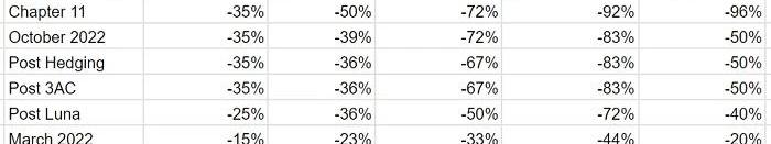 请记住,到2021年底,Almaeda大约有80亿美元的净借款:a)向贷方支付约10亿美元的利息b)大约30亿美元从Binance手中买断FTX持股c)大约40月美元用于风险投资80亿美元的净借款,减去它所拥有的几十亿美元的对冲,导致了大约60亿美元的超额杠杆/净头寸,并得到了约100亿美元资产的支持。随着市场崩溃,这些资产也随之崩溃。Alameda的资产——山寨币、加密公司、上市股票和风险投资的组合——在这一年里下跌了约80%,其杠杆率一点点提高。