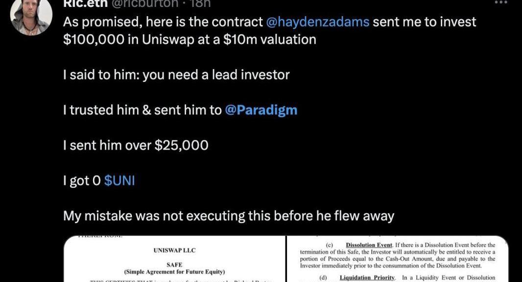 Uniswap早期支持者:我为何要起诉HaydenAdams?针对Balance前首席执行官RichardBurton的「控诉」,Uniswap创始人HaydenAdams给予了回应:1/Ric是我在开发Uniswap大约8个月后认识的众多早期支持者之一。2/我一直在犹豫是否要对其进行反驳,因为目前他正在起诉我,但我还是想分享一些细节帮助澄清事实。3/Ric曾经有投资Uniswap的机会,我给了他一张没有填写金额的SAFE,这样他就可以填写想要投资的金额。他并没有进行投资,并表示是由于当时Balance的资金只够支持1个月。