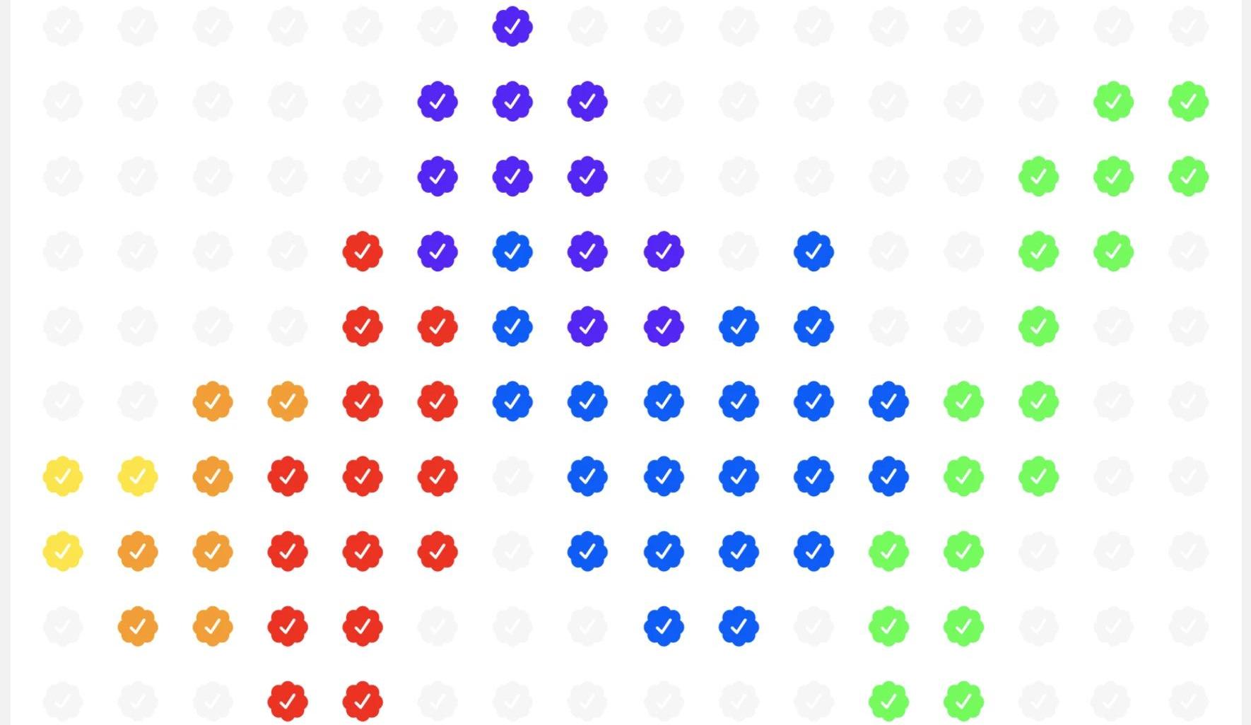 如果仔细来看,你会发现所有的Checks都是相同的版本,颜色和排列位置都没有改变。那么如何判断稀有度呢?难道大家买的都是同一张一模一样的小图片?针对该疑问,Checks创始人在推特发布了后期玩法:燃烧生成更稀有的版本。JackButcher表示是受到了DamienHurst的“TheCurrency”的启发,才开始与团队想出一个销毁机制。他们发现80等于其部分因数的相加。根据这一规律,JackButcher将每一阶段的Checks含有LOGO的数量定为40、20、10、5、4和1。如果你有两个原始的80-CheckNFT,你可以将它们都销毁并获得一个40-CheckNFT。如果你想获得一个20-CheckNFT,则需要销毁两张40-CheckNFT,以此类推:80>40>20>10>5>4>1>0。总而言之,你需要64个版本才能一直燃烧到1-CheckNFT。由于一共只有16,000多个版本,因此可能存在的1-check的上限为250个NFT。