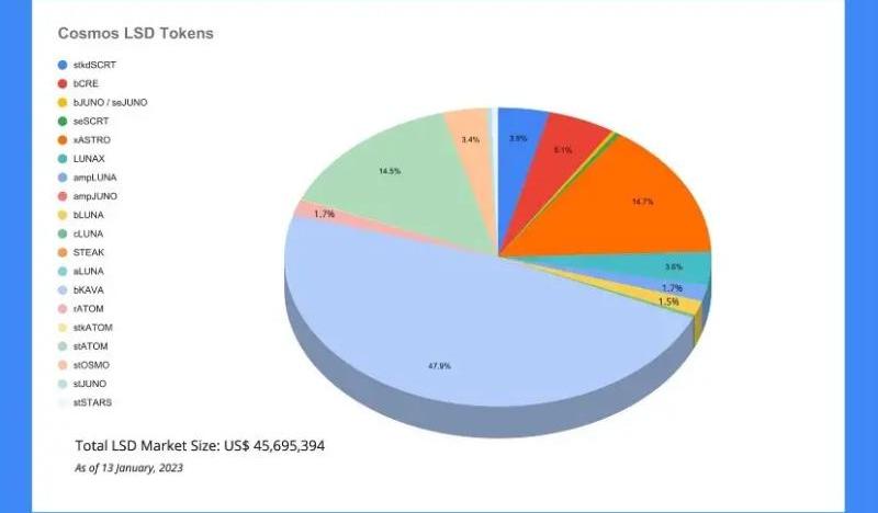 随着LSD代币的普及和更多Cosmos参与者利用其经济效益,LSD代币的数量和相关价值正在稳步上升。下面的图表和表格总结了Cosmos中LSD市场的现状。