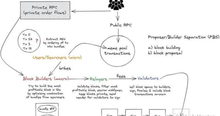 内存池里的交易对每一个节点来说是不同的,但是对于整个区块链网络上来说,他所包含的数据却是公共的。换言之,只要有人能够在全球各地云服务器上架设节点,他就可以获得大部分的内存池数据。内存池数据的滥用,对于普通用户来说是极其不友好的。正如我在开头所讲述的案例中一样,套利者可以提前知道用户的交易意图从而进行获利。这一获利的过程我们称之为MEV。搜索者:也称为以太坊机器人操作员,目前我们所了解的套利者、nft-mint机器人都可以归类到搜索者这一个范畴。搜索者和Flashbots息息相关,在Flashbots开源了他们的拍卖组件之后,搜索者可以通过发送捆绑包的方式,将自己的交易或者是内存池的交易按顺序拼接起来,并且指定某个区块构建者让他们把这个捆绑包里的交易包含在区块里,从而避免其交易在公共内存池之中被嗅探到。