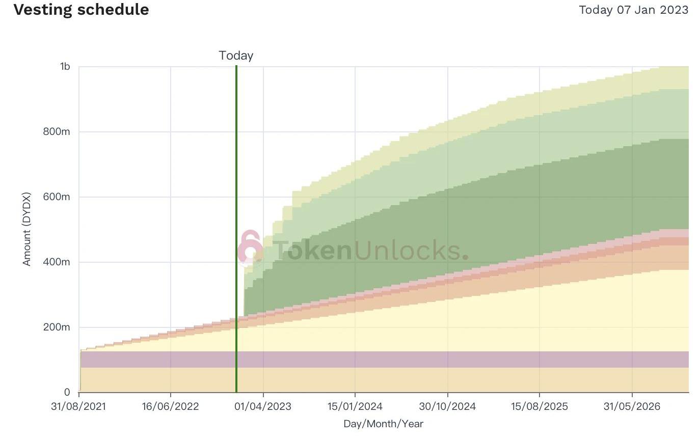 除常见的解锁类型外,一些特殊情况值得投资者格外注意。以DYDX为例,最近一次解锁仅解锁占流通量0.6%的代币。但在2月到来之后,将一次性解锁约1.45亿枚投资者和团队代币。新解锁数量占当前流通量的约六成。