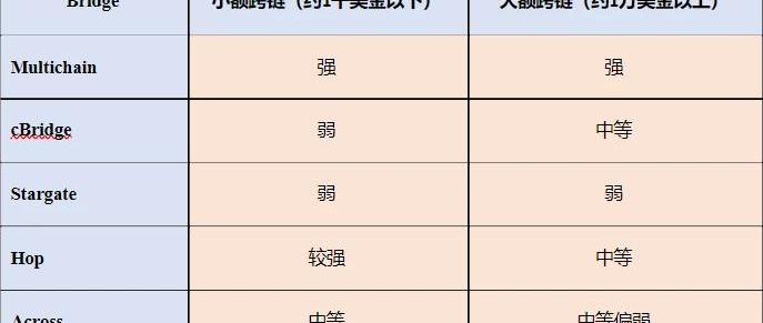 表4资产为USDC的跨链费用竞争力排名注:Stargate的排名是将相应的数据换算成统一标准后得出,ETH按照当时的价格进行计算。表3为不同数额大小的资产USDC从Arbitrum到Ethereum、BNBChain、Optimism的跨链费用和到账数额的情况,根据收集到的情况制作出了反映各跨链桥的排名情况表4。当USDC从Arbitrum跨链到Ethereum,跨链数量为100和1000时,Across与Hop的费用在跨链数量为100和1000时相对较少,表现出较强的竞争力。跨链数量为1万、10万和100U的情况下,Multichain的费用较低,竞争力是最强的;Across的费用较高,竞争力弱;cBridge的跨链费用则随着跨链数量的增加而逐渐减少,但整体竞争力弱于Multichain。Hop在10万U和100万U的情况下费用较高,竞争力弱,在1万U的情况下竞争力情况相对好一些,但还是弱于Multichain。当USDC从Arbitrum跨链到BNBChain时,仅Multichain和cBridge支持USDC跨链,Multichain在100U和1000U时费用较低,竞争力较强,cBridge在1万U、10万U和100万U的情况下费用较低,竞争力较强。当USDC从Arbitrum跨链到Optimism时,无论跨链数量是100、1000、1万、还是10万和100万,Multichain的费用最低,表现出最强的竞争力。Stargate和Across的费用收取较高,竞争力比较弱。主要结论