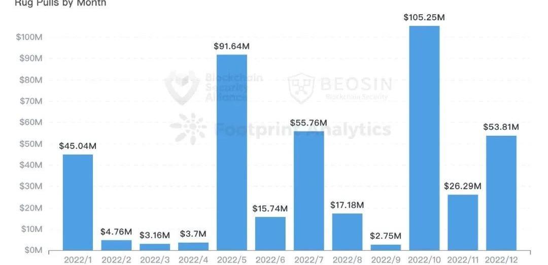 2022年约有13.96亿美元的被盗资金转入了TornadoCash,占所有攻击事件损失资金的38.7%。自8月TornadoCash受到美国OFAC制裁后,转入TornadoCash的资金较上半年大幅下降。第四季度仅有4485万美元的资金转入了TornadoCash。全年约有2.89亿美元的被盗资金得以追回,仅占所有损失的8%。其中绝大部分来自白帽黑客主动返还。约有1824.8万美元的被盗资金流入了各类交易所。通常一些涉案金额较少的黑客会在攻击后立刻将资金转入交易所。对交易所而言,能在攻击发生的及时识别黑客地址并阻止其交易尤为重要。约有4.43亿美元的被盗资金被交易所冻结,其主要金额来源于10月的BNBChain事件,当时币安立即冻结了黑客80%至90%的资金,实际损失在1亿美元左右。七、Rugpull数据