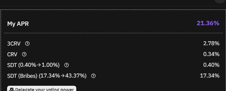 sdCRV分配3CRV费用,并将投票权保留在质押者那里。投票权可以委托给StakeDAO,它结合了市场和OTC贿赂以获得最佳回报。