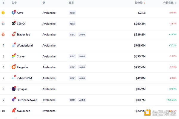 Avalanche链上DeFi锁定资产前十排名及锁仓量,数据来源:Debank