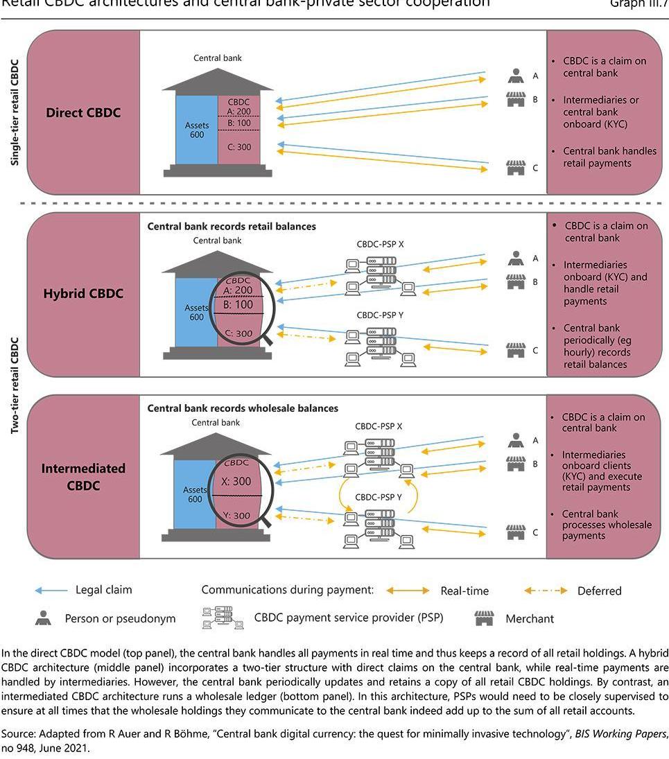 当谈论到CBDC时,平民与掌权的实体,也是他们的潜在的盟友——国内商业银行,拥有共同的敌人。银行的权力和盈利能力直接源于政府授予特权,使其通过贷款进行合法印钞。银行也受益于执行金融合同的法律体系。因此,当债务人无法偿还债款,面临国家的暴力制裁时,银行有权收回其抵押资产。银行家想要盈利,而政府想要权力。权力和利益通常相生相伴,往往伴随争议。银行不计后果的放贷,总是让政府陷入困境。但历史上的政府别无选择,只能容忍他们的放肆行为,因为在CBDC发明之前,需要依靠银行才能使金融体系正常运转。特别是,银行比政府更有能力评估信用风险,因为他们将利润置于之上。不良信用就是不良信用,不管债务人属于哪个政党。由于它们对整个金融体系的重要性,即使当银行搞砸并引发金融危机时,政府也总是不得不介入、印钞并拯救银行体系,而无法对银行造成的破坏进行任何实际制裁。但现在,政府拥有一个工具能完全接管商业银行最重要的职能——即接受、储存和贷出公民的存款。这一切都只需要商业银行业的一小部分成本和人力即可完成。政府和政府的银行,即中央银行,在如何实施CBDC方面有以下选择。他们可以执行以下操作之一:创建一个节点为商业银行的网络。最终用户在银行有一个账户,节点能够在网络上移动数据。我称之为批发模式。央行支持商业银行,因此永远不会出现数字银行挤兑。创建一个只有一个节点的网络,即中央银行。每个公民都有一个直接在中央银行的账户。我称之为直接模型。国际清算银行制作了这张精美的信息图,对各种类型的CBDC进行了分类:
