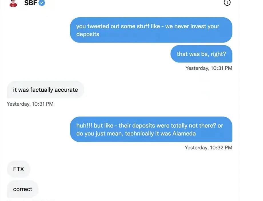 我曾在今年夏天早些时候通过Zoom与SBF进行过交谈,当时我正在撰写他的简介。所以在11月13日,有消息称他的加密货币交易所已经崩溃,数十亿的客户存款消失后,我通过推特私信联系了他。我没想到他会做出回应——通常,正在接受SEC和美国司法部调查的人不会做任何回复。联系上SBF后,他显然想谈谈。关于FTX和他的对冲基金AlamedaResearch如何拿客户的钱,他声称,他们没有意识到自己在做什么。没有意识到谁会被称赞为英雄,谁会成为替罪羊。他还谈到监管问题,谈到他后悔的事情,以及他会如何对待FTX和Alameda。当时已经过了巴哈马时间午夜,我们在推特私信里来回聊了一个多小时。SBF表示仍在努力筹集偿还所有储户所需的资金。当我们交流的时候,我试图弄明白,在公关、慈善捐款和游说的背后,SBF到底相信什么是对的,什么是错的,尤其是他所从事的工作和他所在行业的道德准则。我们的整个谈话中要面对这样一个背景——那些信任他的人失去了积蓄,他已对一开始的承诺造成了无法估量的破坏。我们的谈话结束后,我对他所说的许多话感到震惊。的私信对话。)关于监管