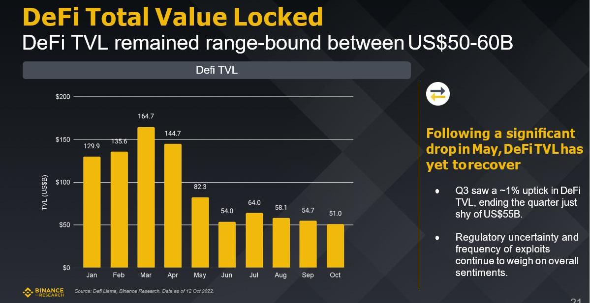 根据截至2022年10月12日Defillama和BinanceResearch的数据显示,在5月份大幅下跌之后,DeFi市场尚未恢复元气,三季度DeFi总锁仓量保持在500-600亿美元区间内。