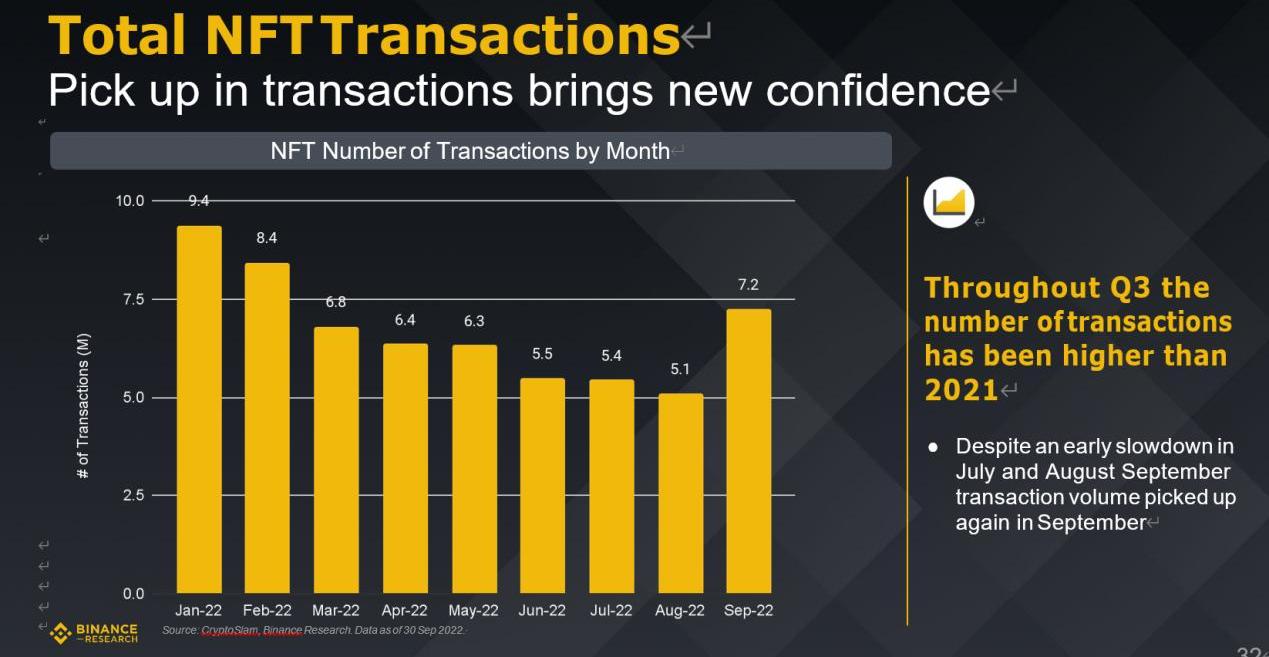 NFT交易总额根据截至2022年9月30日CryptoSlam和BinanceResearch的数据显示,尽管7月-9月的NFT交易量有所放缓,但9月交易量再次回升,与2021年同期相比,整个三季度的NFT交易数量有所增加,而交易量的增加重振了市场信心。
