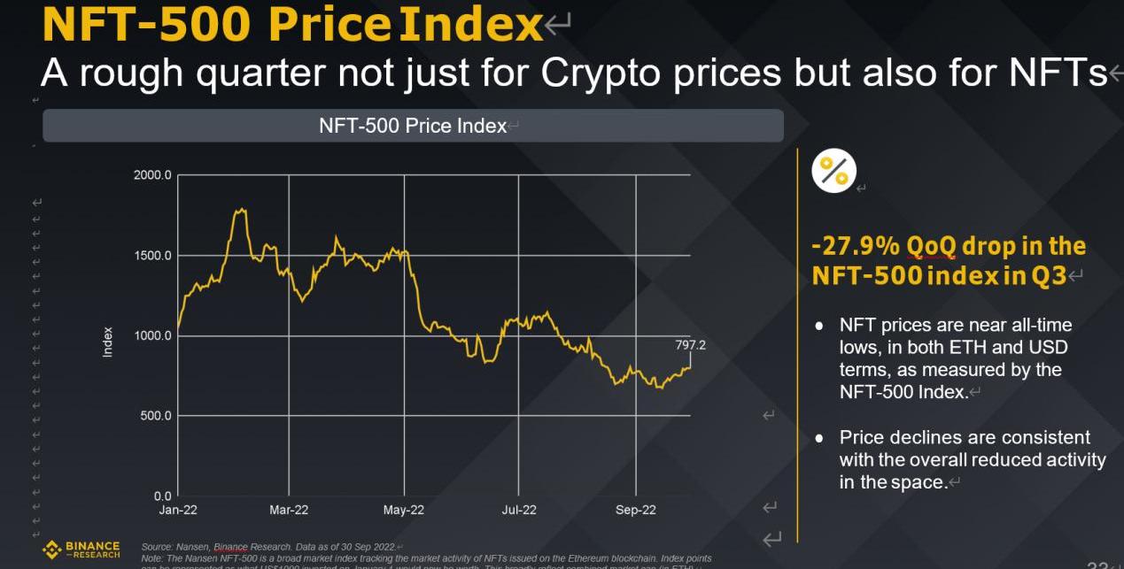 NFT-500价格指数根据截至2022年9月30日Nansen和BinanceResearch的数据显示,三季度对于整个加密市场来说都很艰难,不仅是加密货币,NFT价格也十分不稳定,NFT-500指数环比下跌了27.9%。NFT-500指数显示,以ETH和USD来计算,NFT价格接近历史低点。NFT价格下跌与该领域活动的总体减少息息相关。