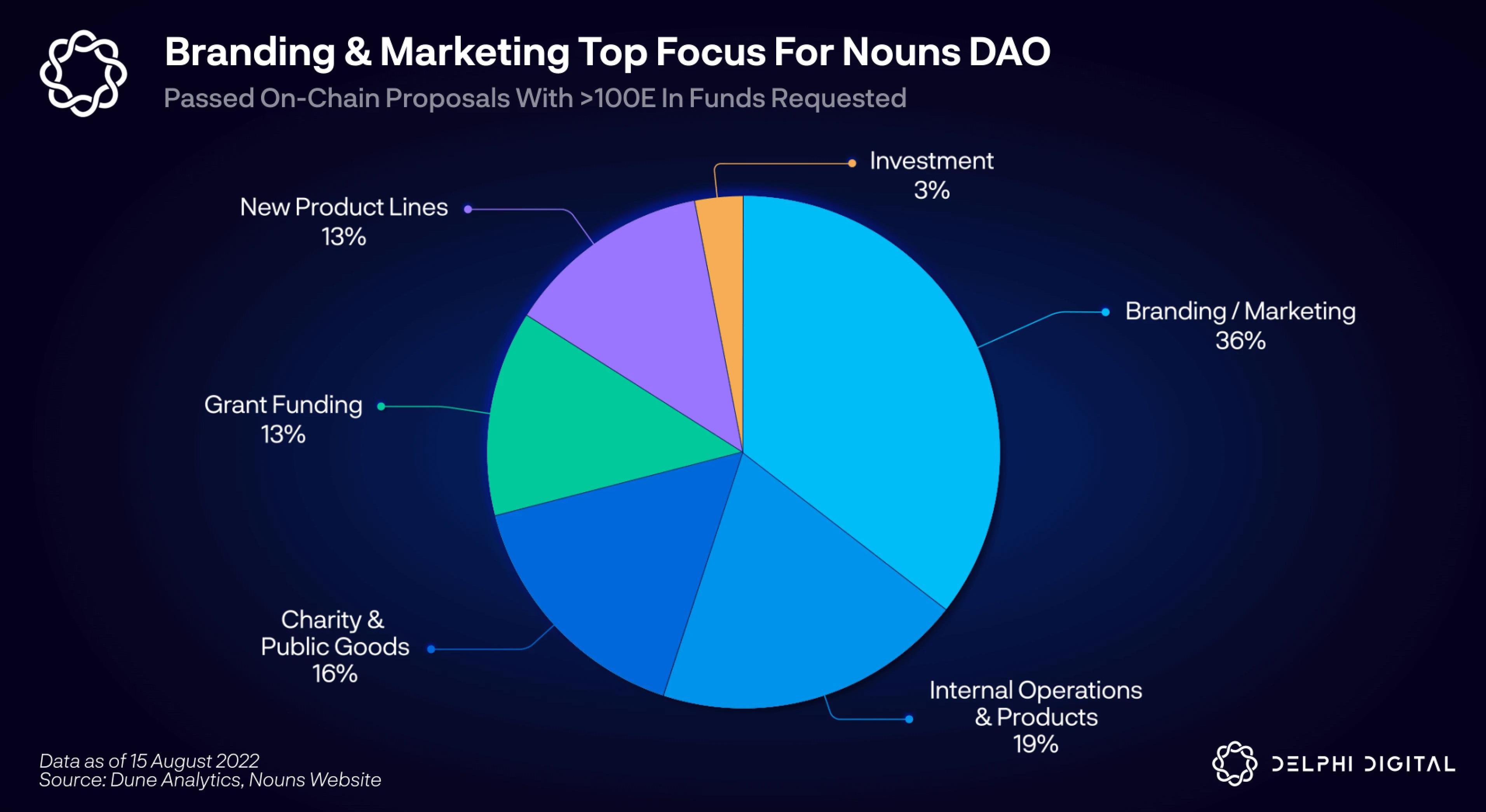 投票参与率非常高,有20-40%的所有者对每一个链上提案进行了投票。这比其他DAO的投票率高出5倍。该指标可以作为一个DAO基本健康状况的良好指标。低参与率是DAO的一个重要问题,因为它意味着一小部分投票可以导致重大决策。NounsDAO中参与率高的原因包括:作为PFP对NFT的所有权使所有者对DAO有更多的投资感紧密和有凝聚力的社区过滤机制确保进入投票阶段的提案符合最低质量门槛到目前为止,排名前三的资助提案的亮点包括:1.NounsAroundTown:一部喜剧纪录片,讲述NounsDAO的故事,以及让Nouns出现在2023年帕萨迪纳玫瑰花车游行中的历程。这部影片预计在美国和全球有2200万观众。大部分资金将用于建造一辆花车和6套真人大小的Nouns服装。2.NounsxFitzFramesPrescriptionSubscription:该提案包括走访学校,进行眼科检查,并为有需要的孩子配发眼镜。目标是在1年内覆盖3000个孩子。3.协议公会试点:通过一个维持链上会员注册的协议贡献者集体,资助以太坊公共产品和协议开发。