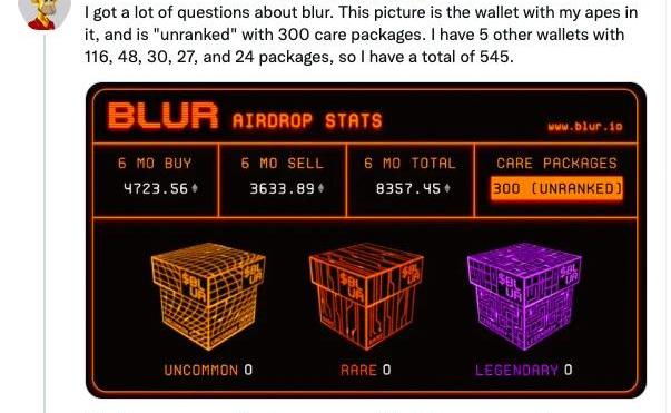 今天NFT市场最引人关注的,莫过于Blur平台推出的盲盒空投。未来空投代币能拿多少需凭手气,欧皇还是非酋全靠开盒。今天上午,Paradigm领投的NFT交易平台Blur宣布正式上线。与此前的Looksrare、X2Y2等采取的获客手法一样,Blur也将目光瞄准此前的资深NFT交易用户,宣布过去6个月在Opensea等交易平台有过NFT交易记录的用户都可以获得代币空投。有所不同的是,Blur本次空投采用盲盒形式,用户领取盲盒后,必须在14天内于该平台List一款NFT才能开盒;盲盒共有三种等级:罕见、稀有以及传奇,不同等级可以领取的$BLUR代币不同,但目前尚未公布该稀有度和代币数量的关系。用户可领取的盲盒数取决于过去六个月的交易量,有OG用户在推特上晒出自己几个账户合计获得了500多个盲盒。