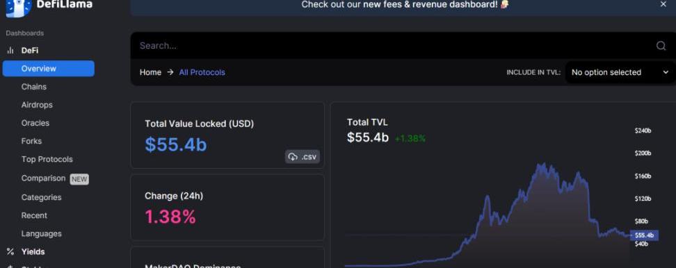 DeFiLlama整合了TVL以及Ethereum,BSC,Tron,Solana等多种加密货币的市场情况。