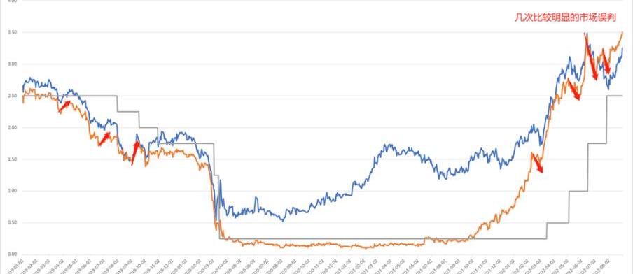 图1-1政策利率与市场利率从图1-1当中我们可以看到,美联储的前瞻指引在大多数情况下是有效的,长期来看美国国债的收益率都会向着美联储预期的方向进行变动。但由于市场和美联储间存在信息差异,市场与美联储的有时会发生短期博弈,并在博弈过程中对政策产生比较明显的误判。