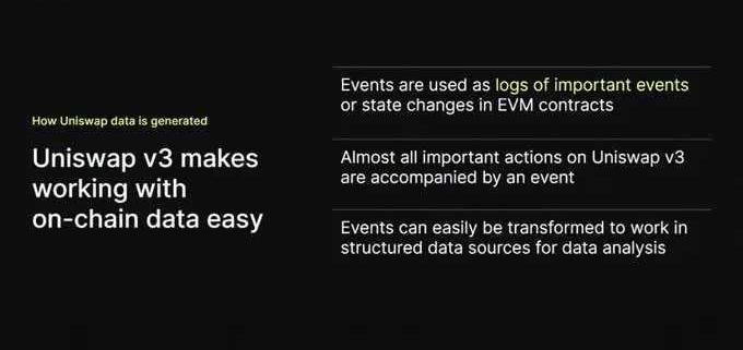 大致可分为三部分:1.Uniswap数据如何产生?Event记录了大部分有用的数据,困难部分是解析这些Event并且记录在数据库里;而Dune解决了这个问题,并在Event之上建立了很多索引。