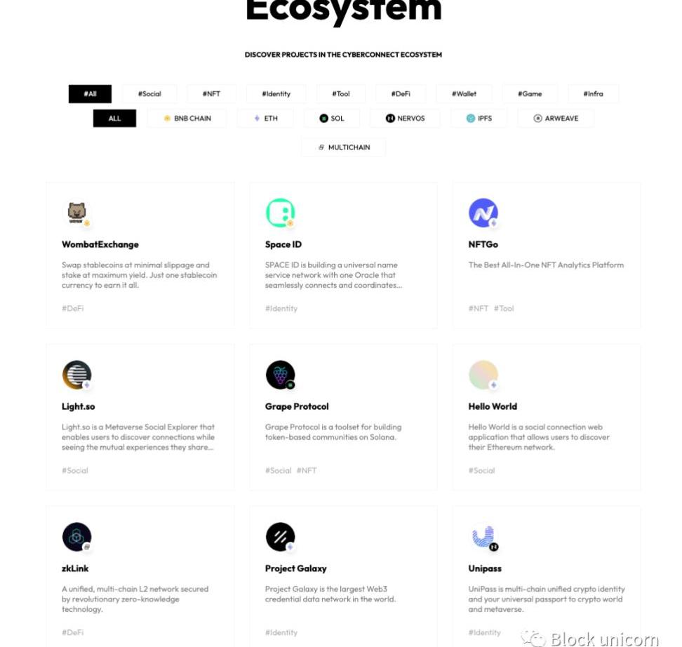 CyberConnect是一个社交图谱协议,允许dapp访问和使用用户提供的社交图谱数据。CyberConnect的生态系统非常强大,集成了很多web3应用,包括ProjectGalaxy、MaskNetwork、Light.so、Grape.art、NFTGo、Metaforo、zklink等等。CyberConnect的社交图谱分为两个部分:1)关注按钮;2)关注和关注者列表。Web3应用程序可以直接插入CyberConnect的社交图模块来开发自己的应用程序,这可以帮助解决冷启动问题,也可以将数据所有权还给用户。因此,用户可以使用自己的社交图谱在不同的应用程序之间切换。CyberConnect的解决方案允许用户在所有应用程序中拥有更全面的身份。