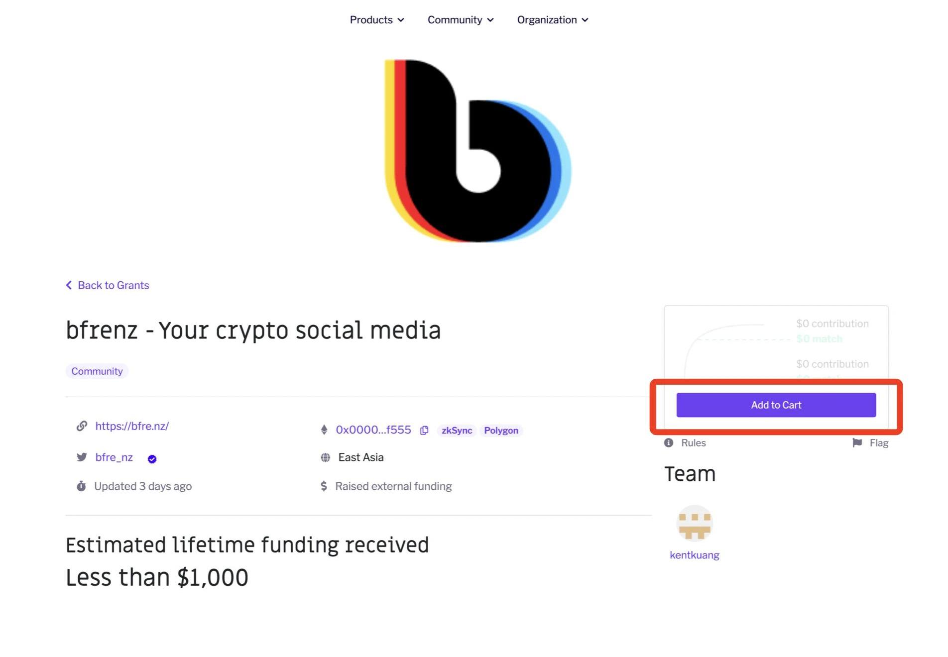 进入项目捐赠地址,右上角“ConnectWallet”,点击页面右侧“AddtoCart”。