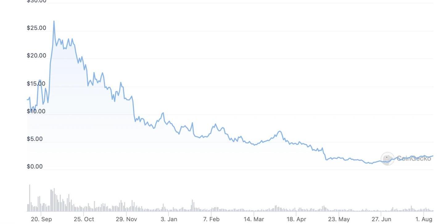 dydx这种业务需要及时清算的dapp来说,不合时宜的升级操作无疑会给用户带来很多麻烦。这其实也是很多人为什么不敢用solana上杠杆或者借贷类产品的原因,当solana死机的时候,如果你有仓位,根本操作不了,只能看着它爆仓。对于tvl越高的项目,越不愿意将自己产品和用户处于这种被动局面。而一旦dydx拥有自己链,在保证协议升级,安全性及产品的正常运行上将具有更大的可控性。在拥有自己的链之后,也能够为dydx代币更多的赋能,不论是作为主网Gas,还是将其更好的融入产品,还是治理方面,都能为dydx代币持有者带来更大的权益。而目前,dydx主网在SterEx上,代币仍在ETH主网上,协议与代币分离。在经历了初期的上涨后,代币市值一路下跌,这也是dydx团队及社区面临的巨大挑战。