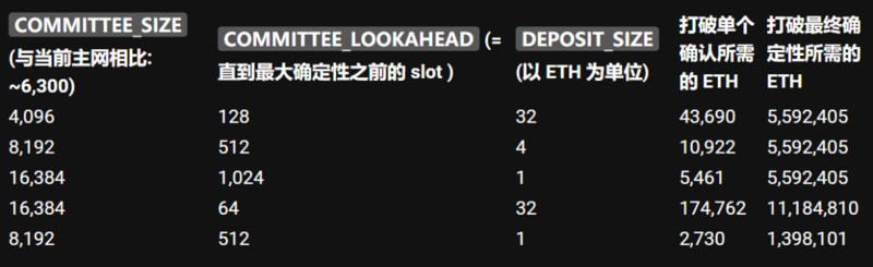 请注意,“打破最终确定性所需的 ETH" 数假设了攻击者控制的验证者数相当于控制了超过总质押的 ETH 的一半 (即数百万个 ETH);这个数字是攻击者将失去的 ETH 。但这不等于任何拥有 2,730, 174,762 个 ETH 的人都可以通过随便烧毁这些 ETH 就能回滚单个 slot 的确认。