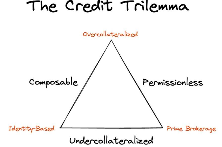 超额抵押借贷体现了链上方法的好处:任何人都可以向协议借贷、借贷或在协议之上构建,而无需识别信息或第三方看门人的要求。基于身份的贷款和大宗经纪贷款都做出了牺牲,以实现更广泛的贷款,但权衡来自不同的领域。去中心化的大宗经纪业务保留了无需许可和自主权,但代价是可组合性和一些去中心化。推动新的用例和合作伙伴关系可能需要集中核心团队的努力,并且可组合性是有限的,因为资金只能在协议定义的边界内流动。相比之下,基于身份的贷款由于通用贷款而保留了可组合性,但放弃了无许可,因为每笔贷款都需要尽职调查和链下看门人的批准。自我主权也受到影响,因为借款人必须自愿提供真实世界的信息,即使最终仅在链上发布最终证明或加密哈希。实际上,我们可以将链上借贷的权衡视为另一个三难困境——信用不可能三角。在一个理想的平台上,贷款将是可组合的、无需许可的和非足额抵押的,但每种解决方案的基本都只能解决两个问题,但是在第三个问题上遭受挑战: