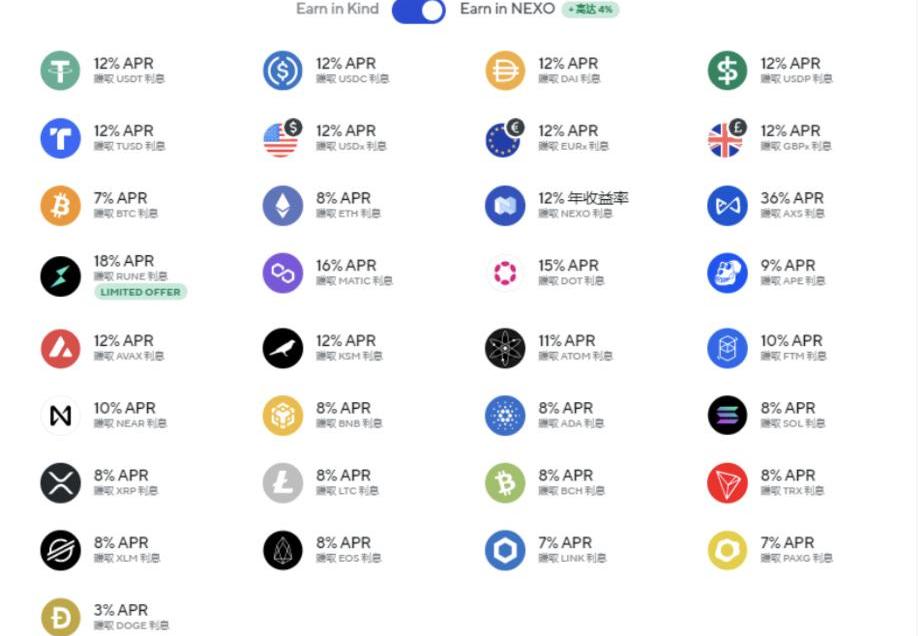 通过对相关平台存款条款的梳理,可以发现如下特征:用户可以选择定期,也可以选择活期。定期存单可以在LTV不足时成为额外抵押品。利息可以以存款币种来发放,也可以以平台代币来发放,二者之间可以任意切换。如果用户选择以平台代币作为利息收益,平台会提供额外的利息收益作为激励。用户可以随时存或者赎回产品。一般来说类似平台都会通过高收益率来吸引客户。此图截取于2022年7月4日,虽然已经发生了众多平台的暴雷,NEXO仍然将这种高收益噱头放在其官网上。