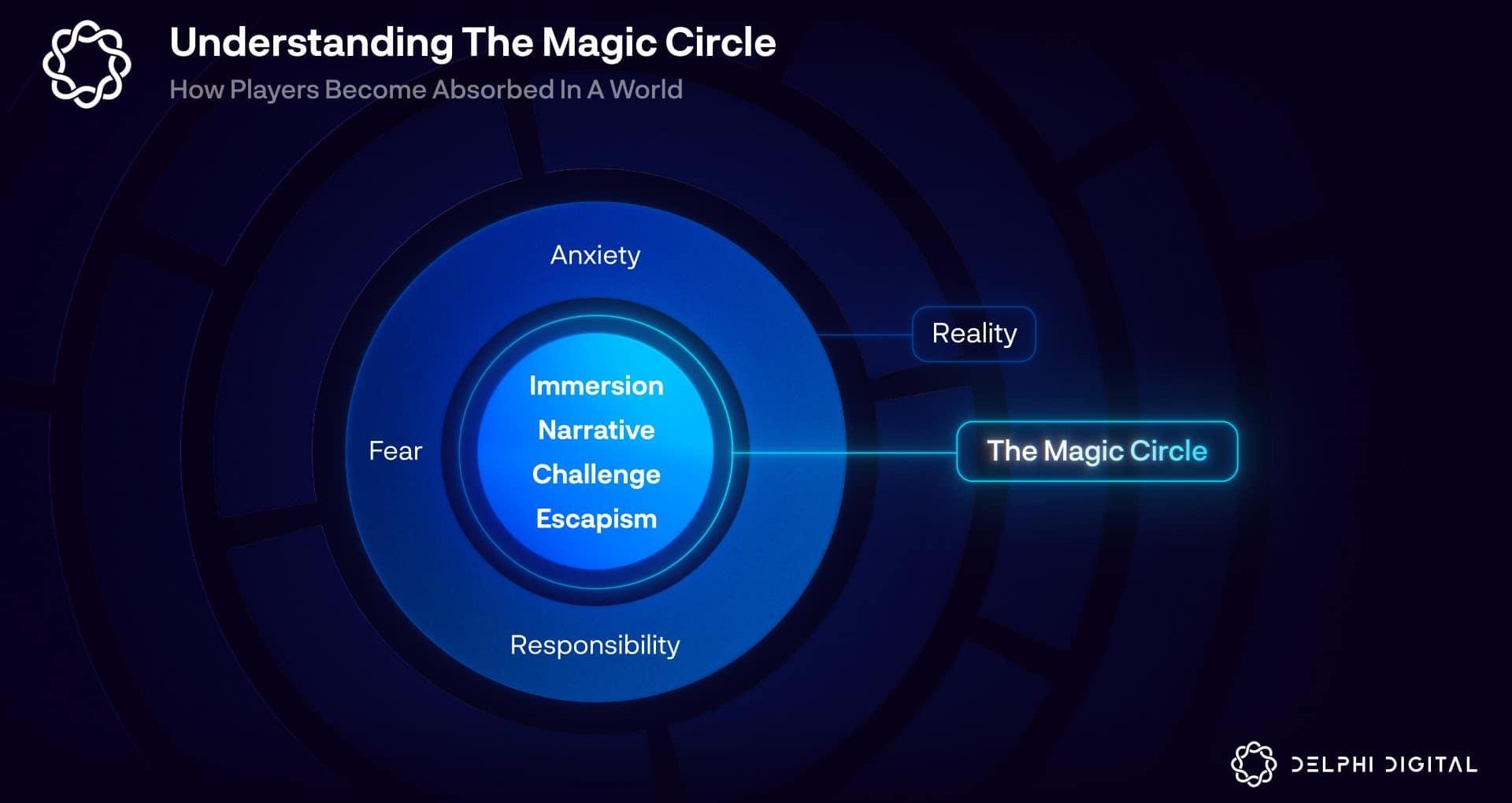 「魔法圈」一词是指现实世界与游戏之间的假想边界。现实,往往带有不幸的包袱和限制,是许多人想希望逃避的地方。游戏的魔法阵可以为他们提供这个避风港。由于人类想象力的非凡本质,在「魔法圈」内,看似平凡的行为可以呈现出非凡的形式。例如,将球踢入球网的简单动作可以完全被改变。也许那个球进入球网实际上代表了世界杯决赛中的一个制胜球。突然间,数十亿人关心这一刻,这一刻具有重大而持久的意义。这里的不同之处在于它发生在一个「魔法圈」内,一个共同幻觉,并且社会对此予以重视。