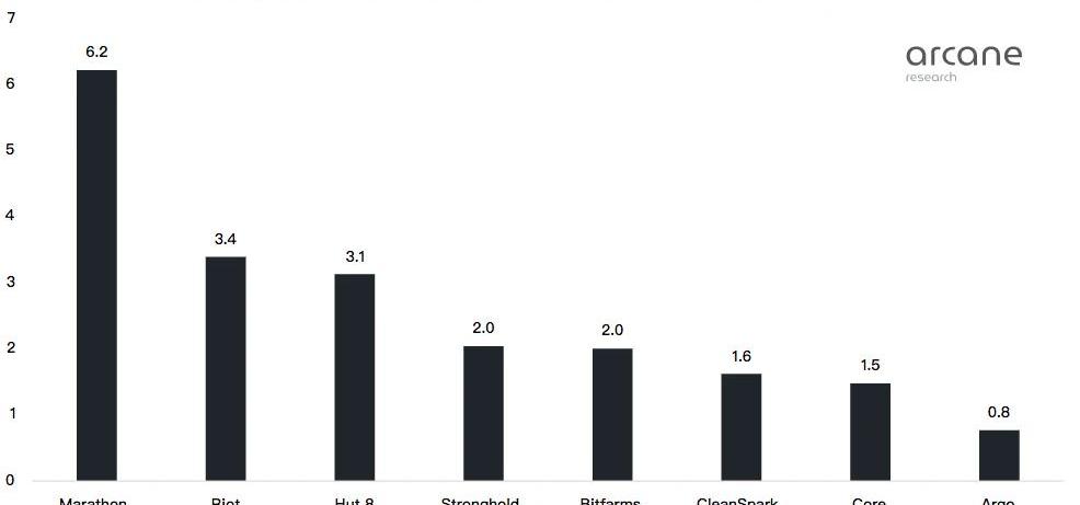 在熊市中,现金为王。拥有最可观的经营现金流的矿工最有能力支付即将到来的费用,如矿机交付或债务支付。下图显示了目前每月的收入,收入成本,以及由此产生的经营现金流。这些数字是根据当前比特币价格下的比特币生产能力估算出来的,没有考虑到未来算力的增加。有两个原因,我没有考虑未来算力的增加。首先,大多数这些矿工在历史上都高估了他们新增算力的能力,他们目前的流动性情况也导致一些矿工取消或推迟扩张计划。其次,目前,不增加的现金流显示了最坏的情况,这也是本分析的重点。