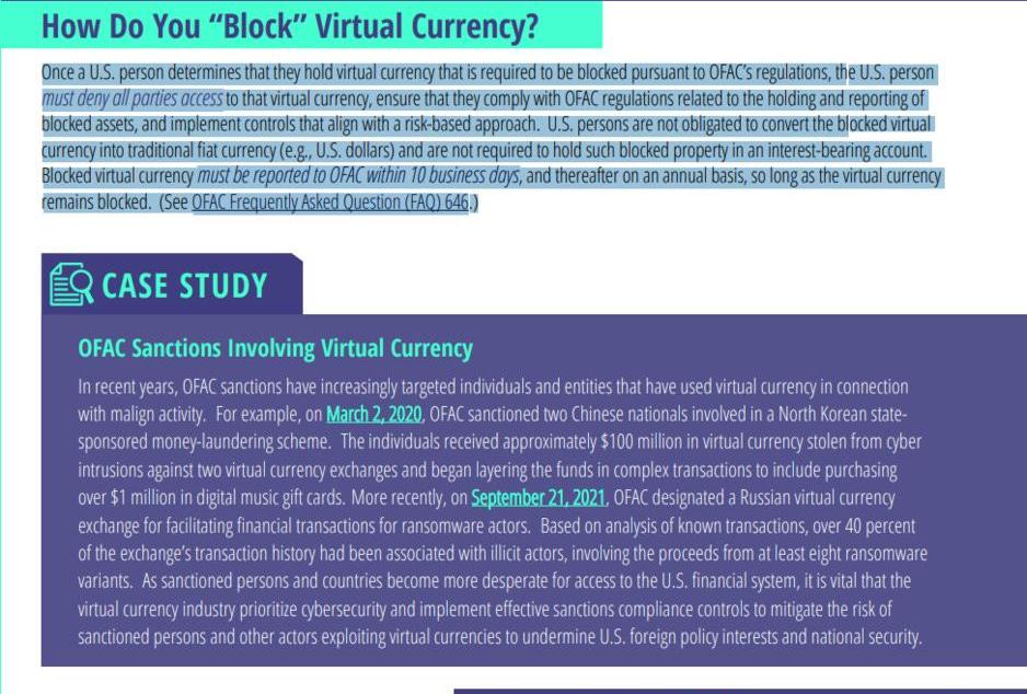 在全球资金流动越来越通过加密协议进行的背景下,OFAC于2021年发布了一本关于虚拟货币制裁合规指南的手册,说明OFAC制裁合规义务同样适用于涉及美国公民虚拟资产持有人。若美国人认为其持有被制裁的加密资产,必须在十个工作日内向OFAC汇报。加密资产行业的成员有责任确保他们不直接或间接参与OFAC制裁禁止的交易,例如与被制裁人员或财产进行交易,或从事被禁止的贸易或投资相关交易。OFAC有权对未能遵守的行为实施民事处OFAC制裁要求。