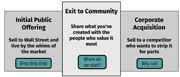 这些标语倡导由用户社区拥有、开发和管理的平台。具体来说,“退出社区”的概念通过明确阐述公司发展所有权的第三种方式影响了去中心化治理。