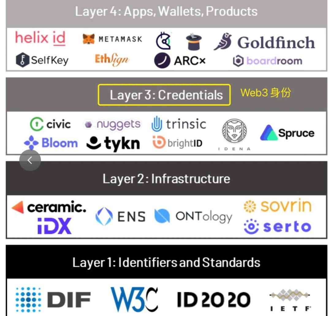 DID项目可以大致划分为四个赛道:链下身份认证类、链上身份聚合类、链上信用评分类、链上行为认证类。值得强调的是,DID成熟形态尚不清晰并没有严格的定义,有些项目是身份协议,有些是凭证网络或者身份应用,且专注于不同的应用场景。未来DID很可能是一个整体其中有各种组成部分。a.链下身份认证假设一个人毕业于斯坦福大学,曾在谷歌当工程师,在硅谷有两套房,如果上述信息能够得到认证而与这个人持有的一个地址绑定,那么这将为他在链上的社交、借贷等各种活动提供加持。BrightIDBrightID是真人身份验证的代表性项目,它构建了一种社交身份网络,目前其已有超过5.7万名用户。用户需要预约zoom视频会议,通过人脸识别和验证官复核保证身份唯一性。VeriteVerite由UDSC的发行方Circle公司于5月10日推出,其中KYC是其身份验证的关键之一,具体细节有待项目方进一步披露。b.链上身份认证这类的DID项目并不关注线下的情况,而是通过「数字身份」这一概念实现链上身份信息的聚合管理UnipassUnipass是这类项目的代表之一,它做的事情正是链上身份的聚合管理:通过一个UnipassID,用户可以绑定邮箱、多个ETH地址,并连接社交图谱、信息聚合平台等协议,变成用户在Web3的「OnePass」。SpruceSpruce是一个数字身份认证系统,其产品套件为用户的身份验证、凭证和存储提供支持,提供数据去中心化访问控制以及Web2API与Web3之间的互操作。与Web2现有平台账号的绑定,对于一些已经在Web2中有一定影响力的人而言,是一个很不错身份增强方案。c.链上信用评分这类项目的初心非常直接——拓展Defi借贷的场景,把现实世界中金融行业的信用机制在Web3中找到某种实现。ARCxACRx通过发行「DeFiPassport」,根据每个DeFiPassport信用分来量化其信誉度。相比于前两类DID项目,链上信用评分类项目更聚焦于用户「数字金融身份」,使用的也多是链上交易数据而非其社交数据。d.链上行为认证这类项目的核心逻辑是,引导用户参与某些合作方要求的活动、行为,并对其颁发链上认证。ProjectGalaxyProjectGlaxy严格意义上来说不是身份协议,而是一种凭证网络。用户连接钱包后即可生成一张「银河身份证」,根据地址的历史行为,自动贴上比如「Uniswap交易员」、「OpenSea交易员」等等认证。项目方与Galaxy交互会被收取费用,同时Galaxy也会给予对应的curator代币奖励。隐私层