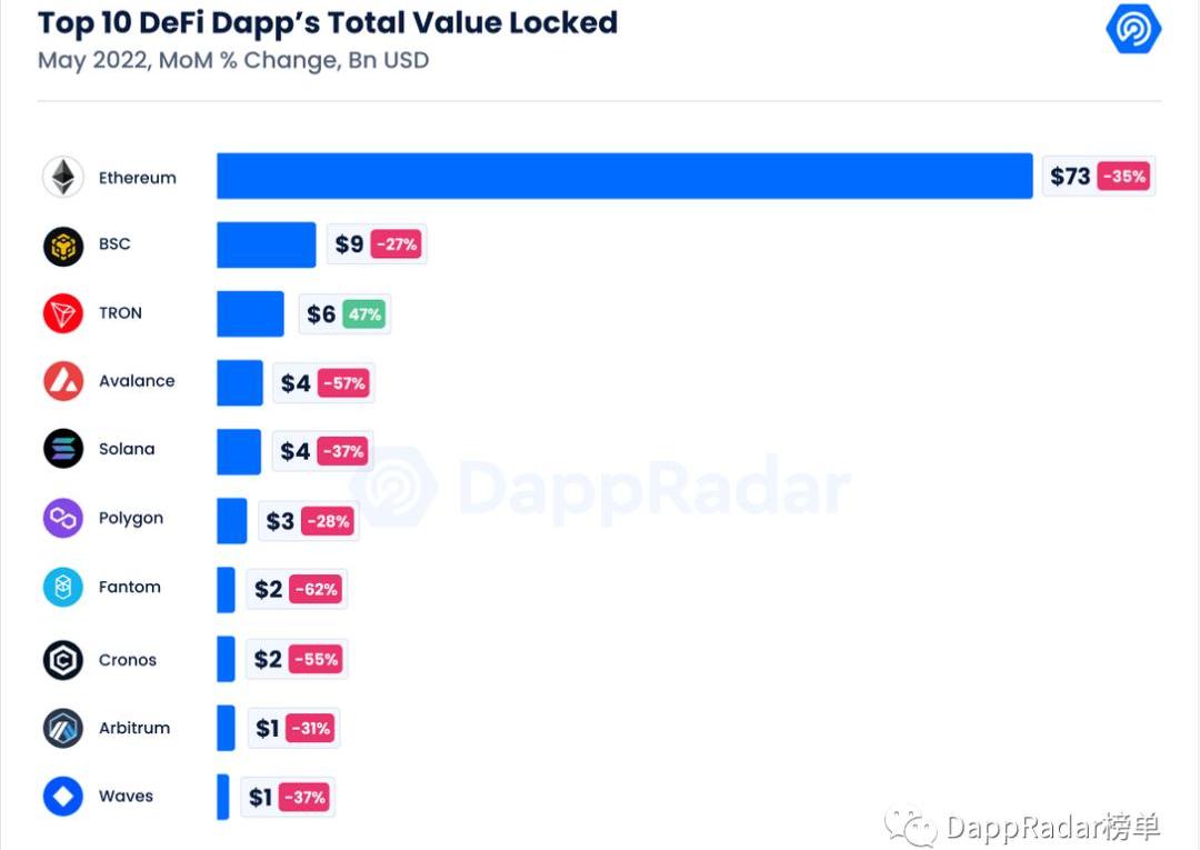 此后,Terra的联合创始人DoKwon宣布了一项复兴计划,其中包括一个名为Terra2.0的Terra硬分叉,该计划于5月28日出现。当天,LUNAClassic代币持有者通过空投获得了新版LUNA,但价值损失了99%。尽管如此,DoKwon的情况还远没有结束,韩国当局正在深入调查数千名投资者受危机严重影响的情况。在4月底,Terra是一个新兴的DeFi生态系统,TVL超过250亿美元,仅次于以太坊。Terra很难在DeFi领域重新获得以太坊亚军的地位了。另一方面,同行区块链将利用这种情况,抓住Terra留下的开发人才和受众。由于Terra的崩盘,DeFi损失了45%的价值