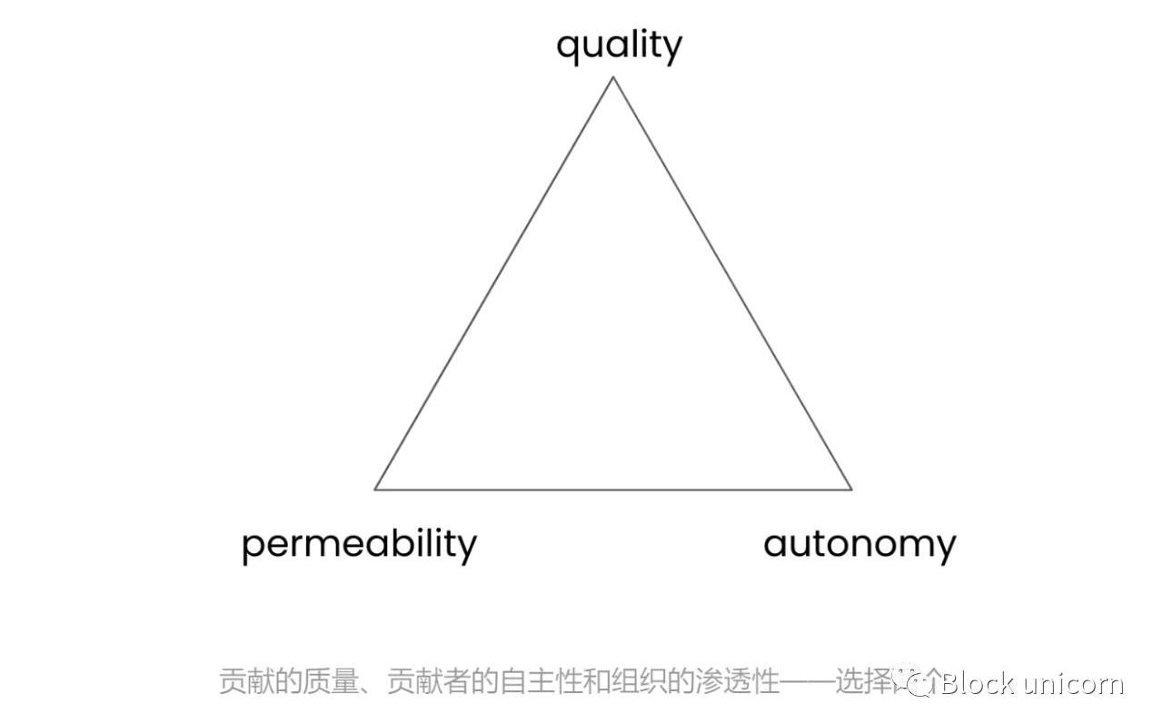 Valve员工手册中的图表Valve和Amazon等公司,美国海军陆战队等精英军事单位,以及intentional生活公社等共同生活环境都在自己周围划定界限,并仔细评估他们允许谁进入。通过不断尝试提高标准,他们可以在不需要的情况下继续扩展了解更多结构和规则。再次来自Valve:我们相信,如果我们小心谨慎,工作会变得越来越好,这似乎是违反直觉的,其实这是雇佣伟大的、有成就的、有能力的人产生直接结果。然而,让所有事情顺利进行是一个很困难的问题,这在很大程度上取决于我们在招聘/招聘时的持续警惕。如果我们开始给公司增加一些能力不如我们的人,让他们成为强有力的、自我指导的高级决策者,那么在文中讨论的很多东西就会失效。DAO经常尝试无需许可,允许任何人加入社区。保持对新来者的开放性、渗透性和包容性方法可以让DAO快速发展、增加多样性并逐步去中心化。但是,在引进最优秀的人才和维持一个开放和无需许可的社区之间存在明显的矛盾: