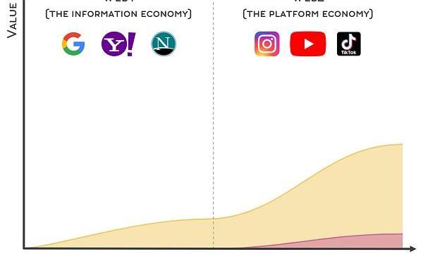 好的,我们知道市场很大。但更重要的是,创作者经济还没有充分发挥潜力:根据InfluencerMarketingHub的一份报告,创作者经济的全球市场规模估计约为1042亿美元。此外,创作者经济在2021年获得了创纪录的资金,有13亿美元投资于该行业的初创企业。与共享经济或协作经济有许多相似之处,后者支撑了Airbnb等独角兽的出现,而创作者经济以巨大而著称,所以很难衡量其市场规模及未来预测:创作者无处不在,以许多不同的方式创作和赚钱。尽管创作者经济还处于早期阶段,但来自a16z和其他几家风险投资公司的专家仍认为它是新技术浪潮中最有前途的市场之一。好的,我们知道这有很大的潜力。现在,让我们简要总结一下智能手机的普及和互联网的民主化,即所谓的Web2,是如何导致创作者经济崛起的。Web2允许创作者浮出水面。事情是这样的:如果您不熟悉Web1和Web2这两个术语,请注意,在接下来的解释中,我们的重点将放在创作者的角度上。长话短说,Web的转变催生了今天创作者经济的基础:Web1|信息经济:仅限消费:互联网基本上是由只读页面组成的,少数创作者将他们的内容上传到网上,供用户访问和阅读主页上的信息。由于几乎没有互动,人们仅仅可以在他们的计算机上阅读由雅虎和谷歌等少数公司在博客和主页上制作的内容。因此,几乎所有的价值都流向了这些内容的建设者。Web2|平台经济:读写有了更强大的互联网连接、智能手机和用户友好的应用程序,更多的人可以加入互联网并毫不费力地与他人联系。现在,任何人都可以轻松地进行与其他用户的交互,并以最多样化的格式创建内容,而且最棒的是:无需代码知识。这种新的现实让创作者行业浮出水面,最终开始从他们的内容中赚钱,无论是通过广告、订阅、数字产品还是与品牌的合作。创作者经济迅速蔓延到世界上几乎每个国家,展示出巨大的增长迹象,这些迹象很快被大型科技公司发现。Web2允许创作者加入互联网并分享其部分价值,如下所示: